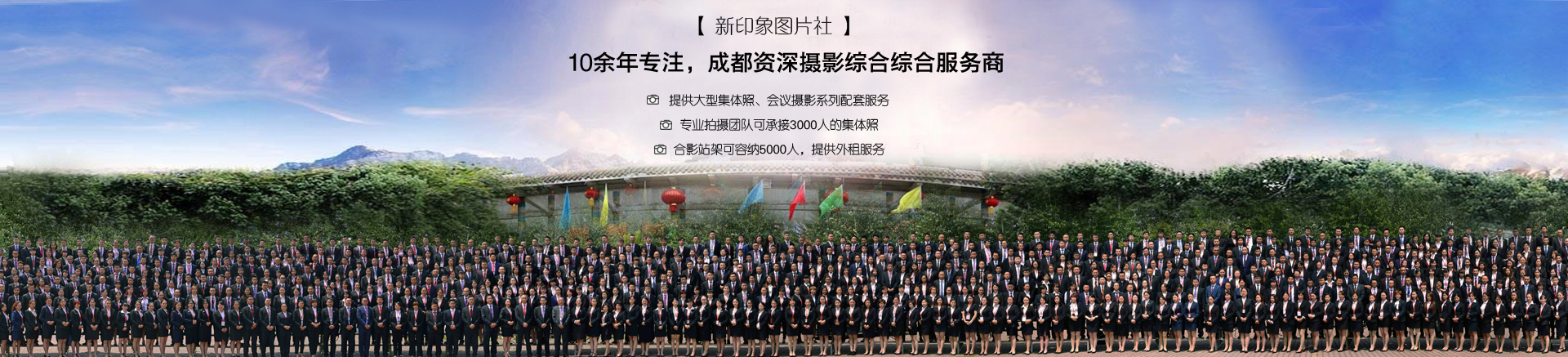 专业拍摄几十至上千人的大型团体合影,专业的摄影技术保证上千人的合影清晰可见。本社自备活动台阶,排列方便整齐,数次成功完成省、市重大会议大型团体合影任务,现为政府会议定点拍摄服务机构之一。